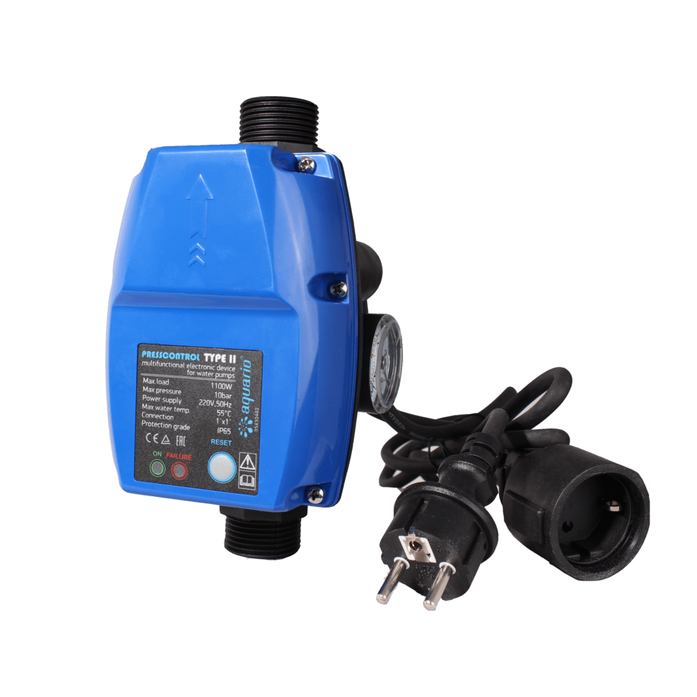 Блок автоматики Aquario Прессконтроль тип II - блок автоматики для управления однофазными насосами мощностью до 1,1 кВт. Автоматика осуществляет включение насоса по потоку и минимальному давлению, выключение при отсутствии расхода воды (перемещения воды через блок). Также блок осуществляет защиту от работы без воды (насос отключается при отсутствии воды в источнике).