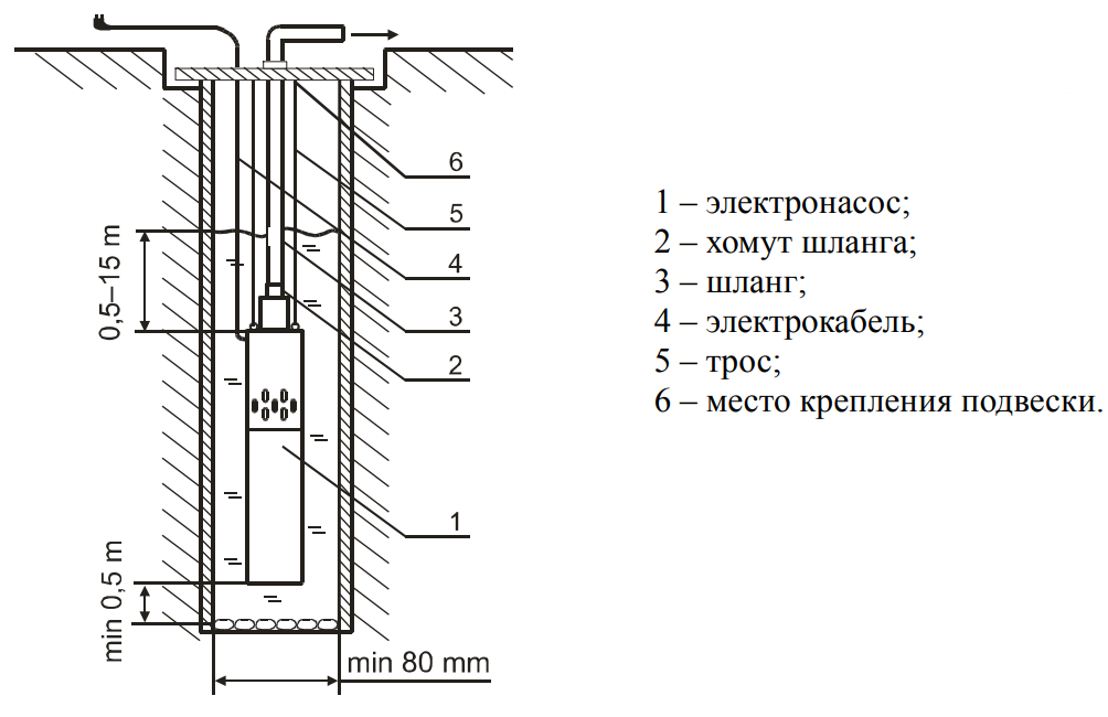 Максимальная глубина опускания насоса под зеркало воды не более 15 метров, минимальное расстояние от дна источника не менее 0.5 метра: