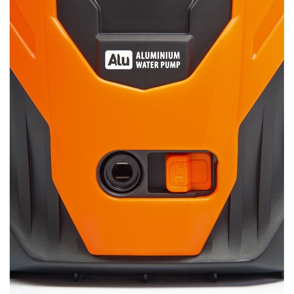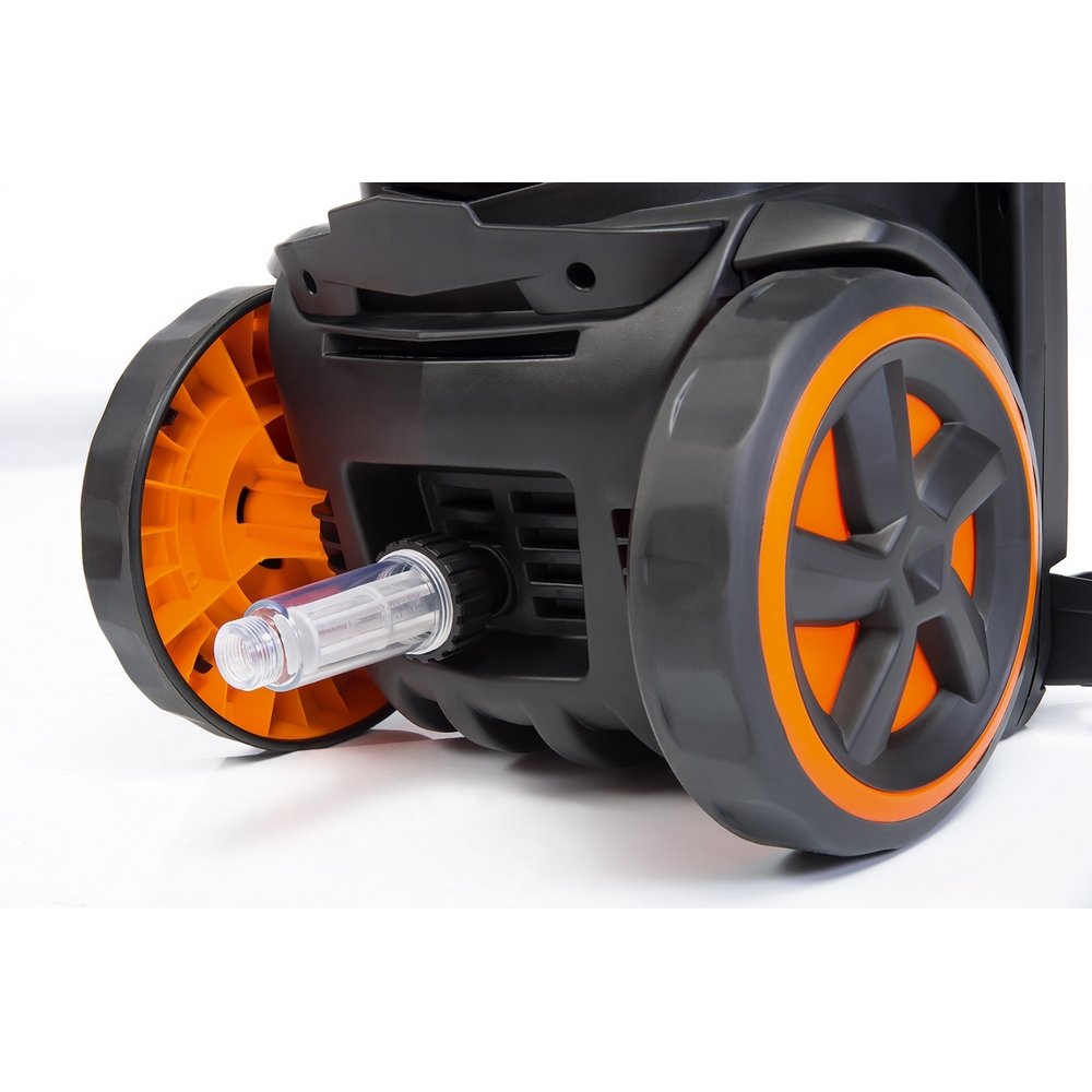 корпус мойки, нерегулируемая жестко фиксированная ручка и все компактные места креплений выполнены из крепкого антикоррозийного технопластика, помпа – из алюминия, нижняя часть устройства и обода колес прорезинены: