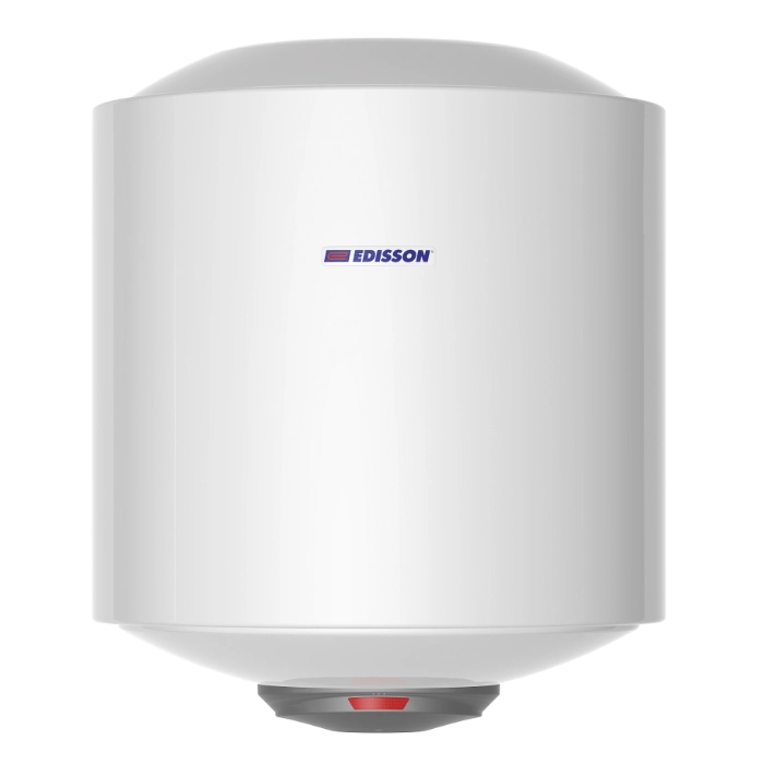 Накопительный водонагреватель состоит из корпуса, нагревательного элемента, термостата, предохранительного клапана и защитной крышки с элементами управления. Внутри водонагревателя Edisson ER 50 расположен стальной бак, который теплоизолирован экологически чистым пенополиуретаном. Два резьбовых патрубка служат для подключения к системе водоснабжения: с синим кольцом – для подачи холодной воды, а с красным – для выпуска горячей. Бак имеет специальное стеклофарфоровое покрытие, защищающее внутреннюю поверхность от химической коррозии. На съемном фланце внутреннего бака смонтированы: нагревательный элемент, термостат и магниевый анод. ТЭН служит для нагрева воды, а термостат обеспечивает возможность регулировки температуры нагрева до +70°С (±5°C). Магниевый анод предназначен для нейтрализации воздействия электрохимической коррозии на внутренний бак.