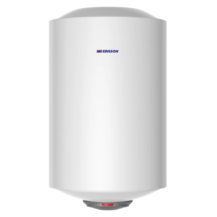 Накопительный водонагреватель состоит из корпуса, нагревательного элемента, термостата, предохранительного клапана и защитной крышки с элементами управления. Внутри водонагревателя Edisson ER 80 расположен стальной бак, который теплоизолирован экологически чистым пенополиуретаном. Два резьбовых патрубка служат для подключения к системе водоснабжения: с синим кольцом – для подачи холодной воды, а с красным – для выпуска горячей. Бак имеет специальное стеклофарфоровое покрытие, защищающее внутреннюю поверхность от химической коррозии. На съемном фланце внутреннего бака смонтированы: нагревательный элемент, термостат и магниевый анод. ТЭН служит для нагрева воды, а термостат обеспечивает возможность регулировки температуры нагрева до +70°С (±5°C). Магниевый анод предназначен для нейтрализации воздействия электрохимической коррозии на внутренний бак.