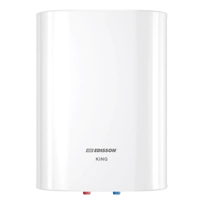 Внутренний бак Edisson King 30 V изготовлен из нержавеющей стали. Пространство между внешним корпусом и внутренним баком заполнено пенополиуретаном — современной, экологически чистой теплоизоляцией, обладающей наилучшими характеристиками теплосбережения. Модели EDISSON King 30 V, King 50 V, King 80 V и King 100 V имеют два резьбовых патрубка: для входа холодной воды с синим кольцом и выхода горячей воды — с красным кольцом.