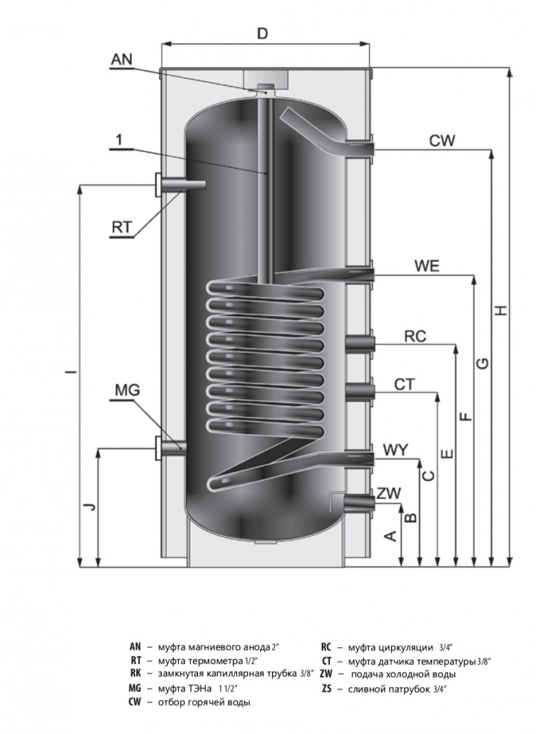 Бак нагревателя выполнен из штампованного листа стали с антикоррозийным покрытием керамической эмалью, наличие большого антикоррозийного магниевого анода, теплоизолятор – из плотного пенообразного слоя 60 мм пенного полистирола (PS), наружный слой корпуса – из пластика или съемной искусственной кожи (skay), предохранительный клапан – из бронзы, трубчатый спиральный теплообменник – из стали с покрытием антикоррозийной эмалью: