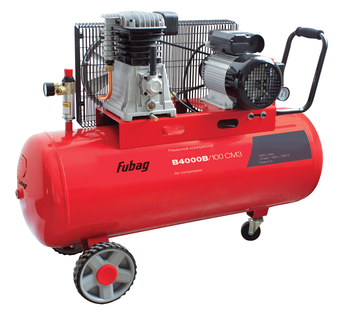 Мобильный воздушный поршневой компрессор масляного типа FUBAG B4000B/100 с двумя однорядными поршнями и ременным приводом создан для сжатия окружающего воздуха до 10 атм и поддержания этого давления в автоматическом режиме в ресивере емкостью 100 литров.