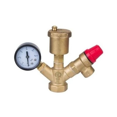 Группа безопасности расширительного бака представляет собой смонтированные на полой консоли предохранительный клапан (настройка - фиксированная, 3 бара), автоматический воздухоотводчик, манометр. Группа безопасности отопления объединяет в себе 3 функции: сброс давления путем слива рабочей среды при превышении заданного параметра (предохранительный клапан), автоматическое выведение газов из транспортируемой среды (воздухоотводчик), индикацию давления в системе (манометр).