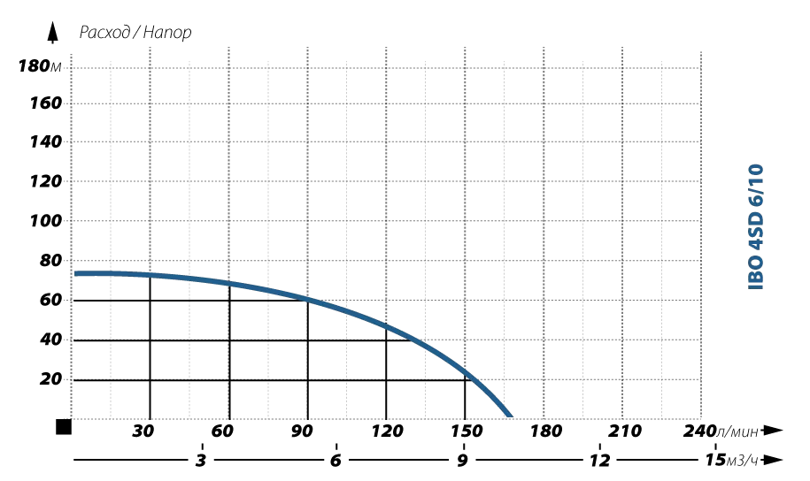 Трехфазный скважинный погружной насос IBO 4SD 6/10 (380В) диаметром 98 мм с повышенной устойчивостью к песку. Насос IBO 4SD 6/10 (380В) доступен к покупке с двигателями IBO и итальянскими двигателями IBO ITALY. В насосе IBO 4SD 6/10 (380В) используется технология «плавающих лопастных колес», а также для основных рабочих элементов насоса применяются износостойкие материалы: латунный нагнетательный патрубок, корпус, вал и сетка фильтра выполнены из нержавеющей стали AISI 304 / а также лопастные колеса выполнены из высококачественной пластмассы, Благодаря этому насос IBO 4SD 6/10 (380В) имеет повышенную стойкость к песку. Насос комплектуется кабелем 1 м, по желанию его можно нарастить до нужного размера. Скважинный насос IBO 4SD 6/10 (380В) имеет отличные характеристики. Напор насоса в максимальной точке составляет 74 м, а производительность достигает максимального показателя в 9.72 м3/час. Мощность двигателя составляет 1500 Вт, то вполне неплохо для насоса с такими напорно-расходными характеристиками. Насосы серии SD марки ИБО были первыми насосами на рынке, названными «анти–песочными». Они по прежнему являются одними из немногих скважинных насосов на рынке, которые имеют конструкции с такой высокой устойчивостью к песку. Максимальное содержание песка в воде – до 5%. Насос IBO 4SD 6/10 (380В) можно применять как аналог насосов ЭЦВ.