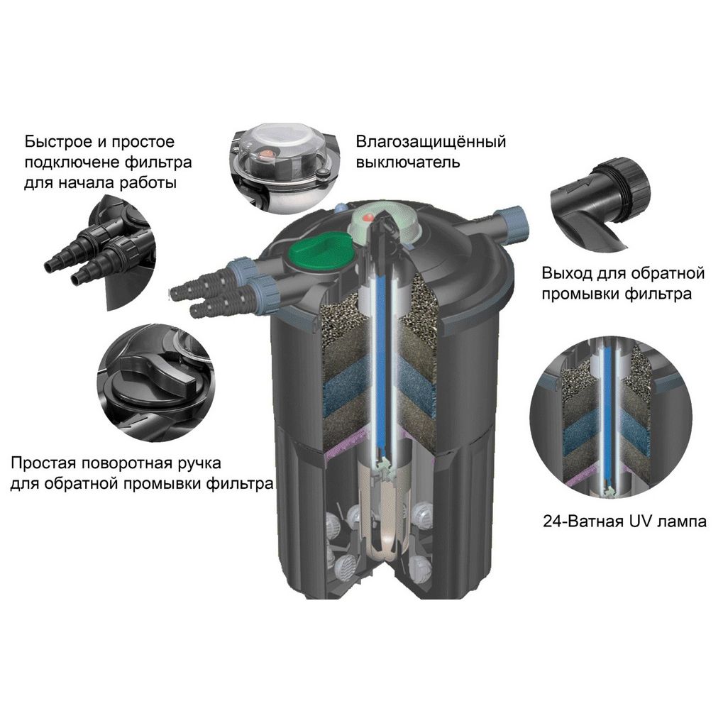 Jebao BF-12000 предназначен для пруда 12000 л, 12000 л/ч, с уф-лампой 18 вт, 220 В, с обратной промывкой, облегчающей процесс очистки фильтра.