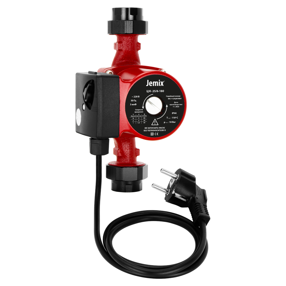 Циркуляционный насос с резьбовым подсоединением JEMIX ЦН-25/6-180 (WRS 25/6-180) служит для перекачки чистых теплоносителей, схожих по составу и вязкости с водой, возможно присутствие 40% этиленгликолевых примесей, в одно и 2-трубных бытовых магистралях отопления и подпольных обогревательных системах. Запитывается от бытовой однофазной сети 220 В 50 Гц.