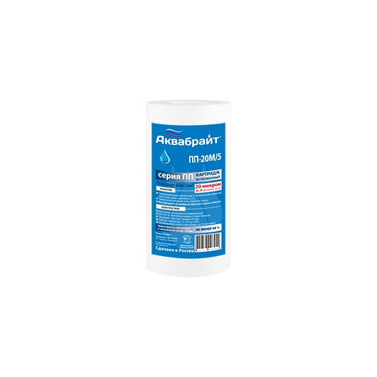 Картридж АКВАБРАЙТ ПП-20 М/5 изготовлен из спеченного полипропилена с пищевым допуском.
