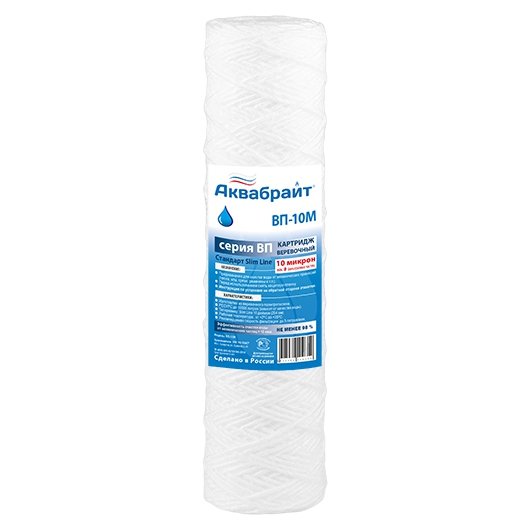 Картридж АКВАБРАЙТ ВП-10 М изготовлен из веревочного полипропилена с пищевым допуском.