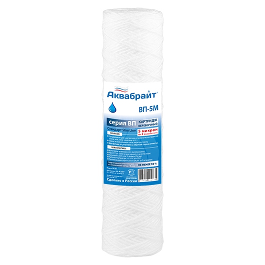 Картридж АКВАБРАЙТ ВП-5М изготовлен из веревочного полипропилена с пищевым допуском.