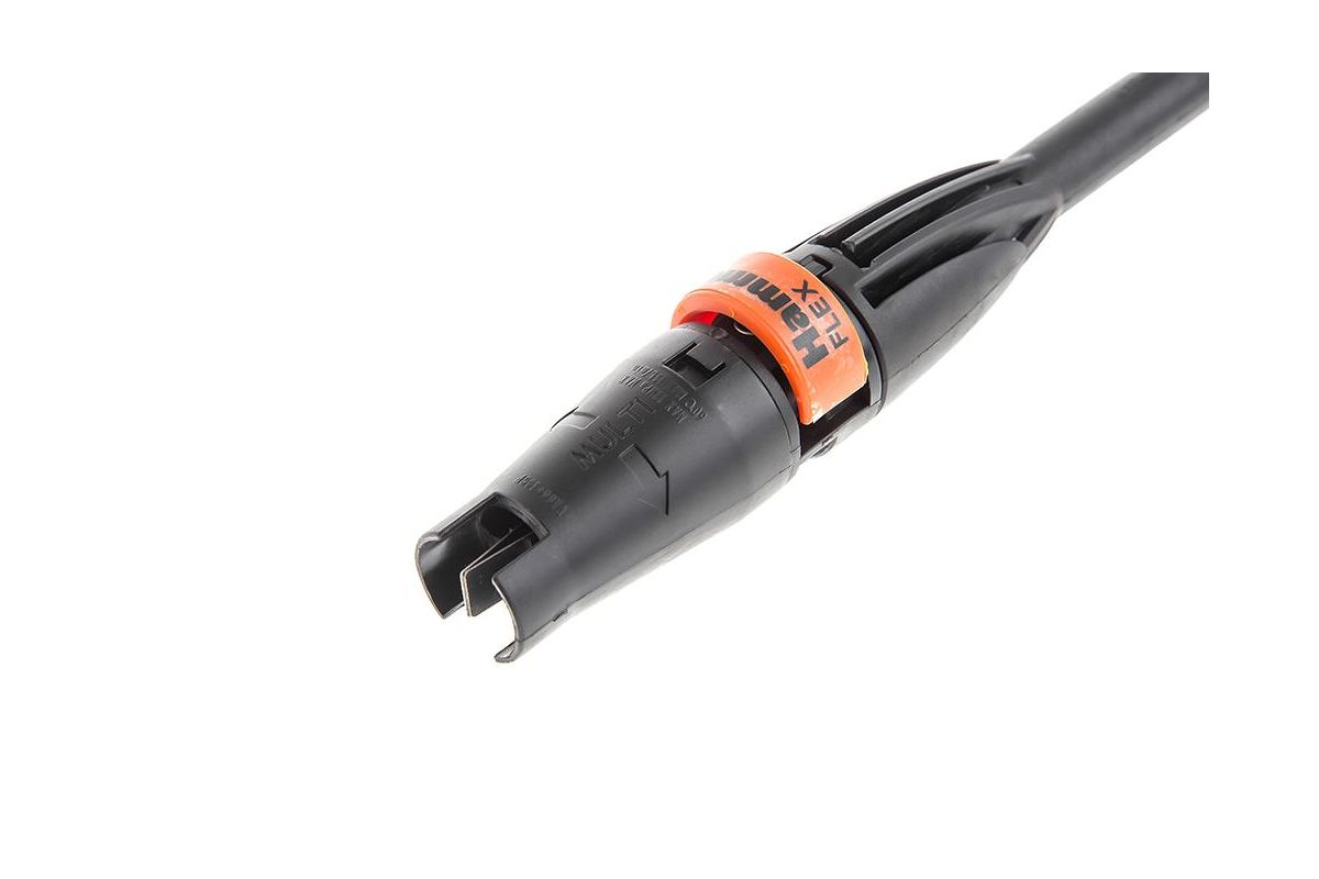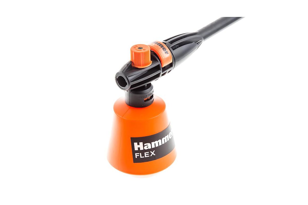 Самовсасывающая система мойки Hammer Flex легко забирает моющее средство и воду из емкости при отсутствии водяного напора. Крепкий армирванный шланг обладает высокой устойчивостью к повреждениям и ударам, его длина, пять метров, помогает расширить рабочее поле. Регулятор факела распыления на пистолете позволяет осуществлять мойку более точно и направленно.