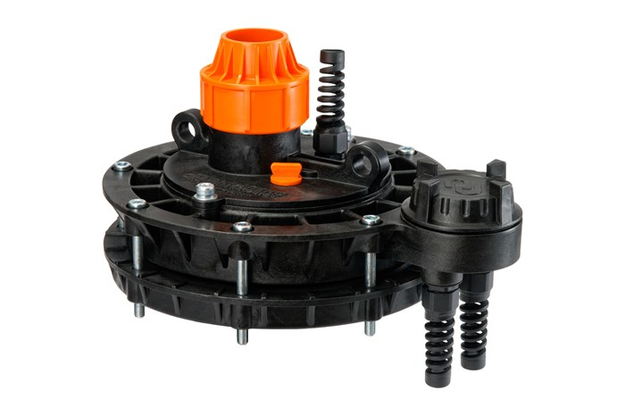 - В крышке впрессован цанговый зажим из латунного сплава для ввода пластмассовой напорной трубы вывода воды;