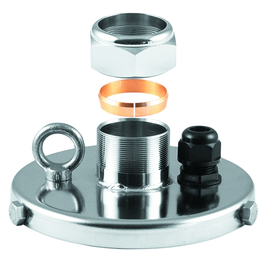 оголовок скважинный в сборе – 1 шт. (гайка зажимная со стопорным кольцом-вставкой, рым-болт с рым-гайкой, пластмассовая заглушка на кабельный ввод, 3 стопорных болта, корпус оголовка);