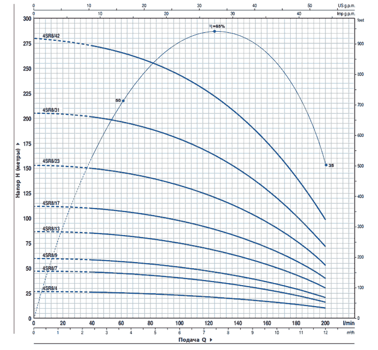 Особая запатентованная конструкция гидравлической части насоса, комбинация используемых материалов и передняя вставка с осевым движением рабочих колес, обеспечивают надежную защиту насоса от попадания песка и от заклинивания. Серия 4SR8 включает в себя МНОГОСТУПЕНЧАТЫЕ ЭЛЕКТРОНАСОСЫ ЦЕНТРОБЕЖНОГО ТИПА, предназначенные для постоянного функционирования в погруженном состоянии. Двигатель подключается к насосу через суппорт, параметры которого соответствуют нормативам NEMA. Принцип функционирования аналогичен принципу функционирования многоступенчатых центробежных насосов. Рабочие колеса, установленные на одном и том же ведущем валу, вращаются внутри лопаточных диффузоров, которые обеспечивают движение жидкости на выходе каждого рабочего колеса по направлению к всасывающему патрубку следующего рабочего колеса. После прохождения через все рабочие колеса, установленные последовательно, жидкость покидает насос через нагнетательный патрубок. Каждое рабочее колесо с соответствующим лопаточным диффузором создают ступень нагнетания, которая, согласно принципу функционирования центробежных насосов, обеспечивает для жидкости перепад давления, который суммируется с перепадами, создаваемыми другими последовательными ступенями.