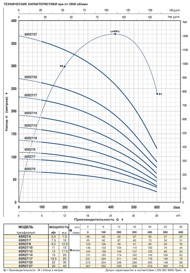 Серия 6SR27 включает в себя многоступенчатые электронасосы центробежного типа, предназначенные для постоянного функционирования в погруженном состоянии. Двигатель подключается к насосу через суппорт, параметры которого соответствуют нормативам NEMA. Принцип функционирования аналогичен принципу функционирования многоступенчатых центробежных насосов. Рабочие колеса, установленные на одном и том же ведущем валу, вращаются внутри лопаточных диффузоров, которые обеспечивают движение жидкости на выходе каждого рабочего колеса по направлению к всасывающему патрубку следующего рабочего колеса. После прохождения через все рабочие колеса, установленные последовательно, жидкость покидает насос через нагнетательный патрубок. Каждое колесо с соответствующим лопаточным диффузором создают ступень нагнетания, которая, согласно принципу функционирования центробежных насосов, обеспечивает жидкости для перепада давления, который суммируется с перепадами, создаваемыми другими последовательными ступенями.