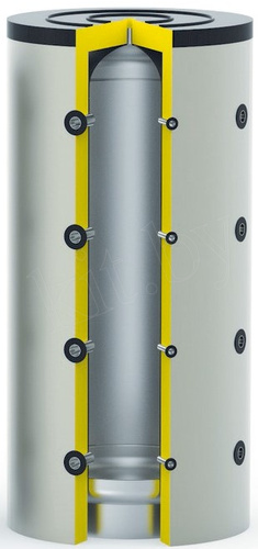 Внутренний бак буферной емкости выполнен из нержавеющей стали марки Ст37-2, наружный слой термоизоляции, созданный по технологии NOFIRE – из плотного полиэфирного волокна толщиной до 70 мм, внешний кожух и верхняя крышка – из противоударного пластика, подводящие и отводящие штуцера изготовлены из толстостенной стальной трубы бесшовной конструкции, наружная сторона бака окрашена антикоррозийной краской: