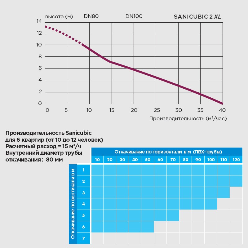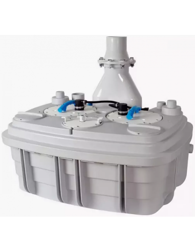 Канализационная двухнасосная станция с большим объемным баком на 120 литров SANICUBIC 2 XL способна откачивать 40 куб.м/час сточных вод в общественных местах: несколько унитазов, ванных комнат, кухонь и прачечных. Насос станции способен поднять давление в трубе слива до 10 метров по вертикали или переправить в горизонтальной трубе воду до 100 метров с температурой до +75 С (кратковременно).