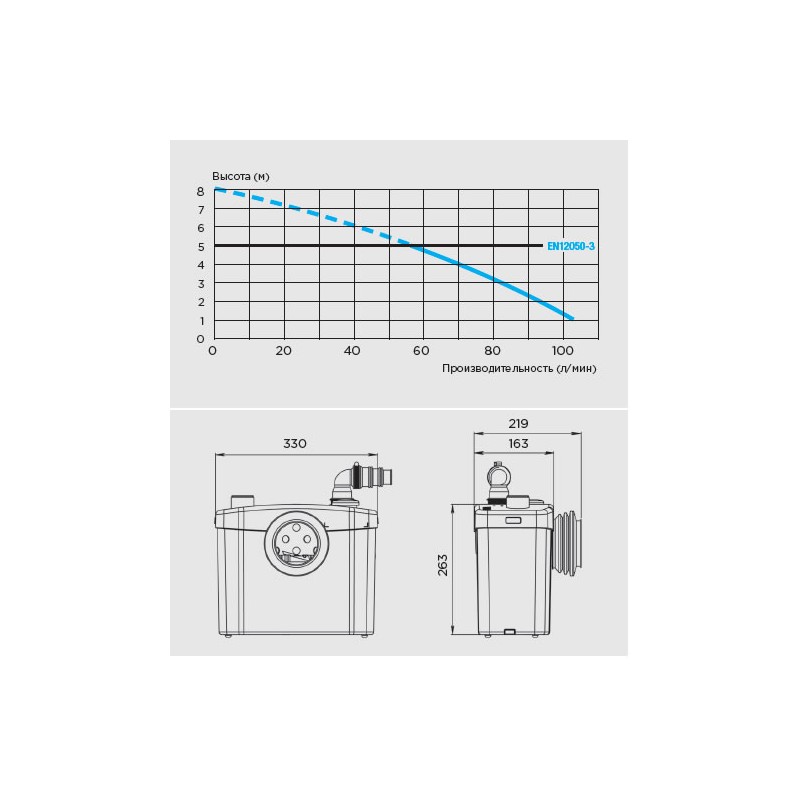 Высота подъема напора при сливе до 5-ти метров, а по горизонтальному трубопроводу – до 100 метров;