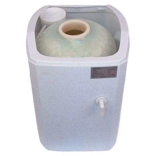 Внутрь колонны умягчителя засыпается ионообменная смола, при протекании воды через которую происходит фильтрация солей жесткости (кальций, магний) и на выходе вода получается умягченная.