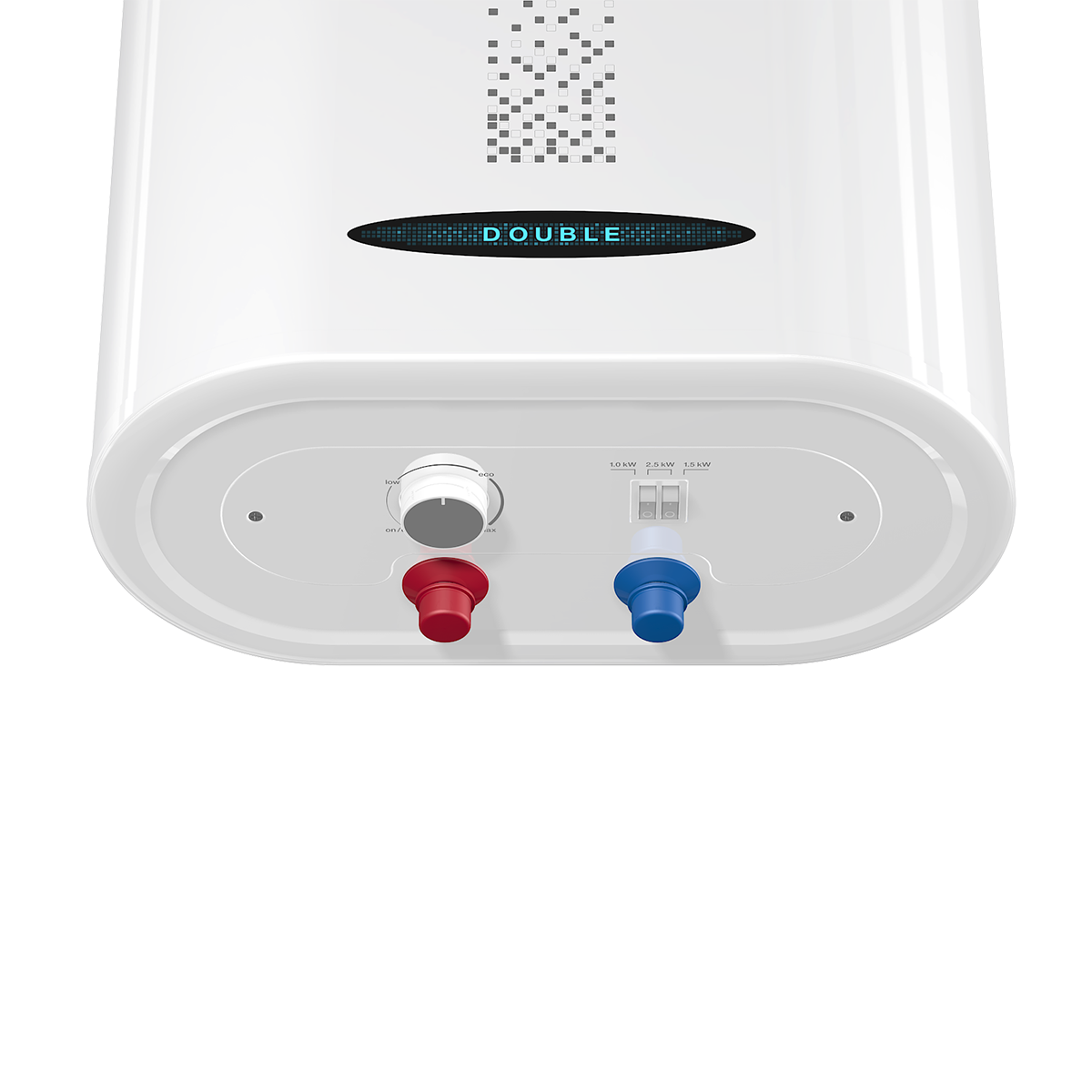 - Компактный плоский корпус. Внутри серии водонагревателей сдвоенная ёмкость из двух узких цилиндров вместо одного круглого внутреннего бака. Такая Технология называется Double Tank, она помогает сократить глубину корпуса, сохраняя объем водонагревателя и делает его более компактным и удобным для установки и эксплуатации — разместить Double можно даже в небольшом помещении и при этом техника не будет мешать.