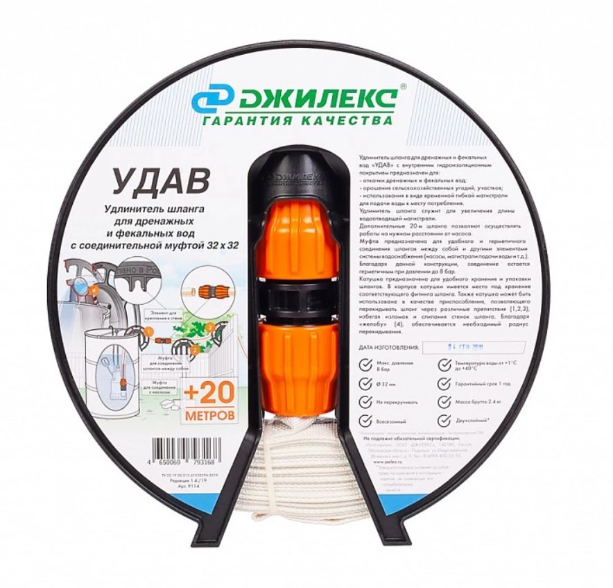 Удлинитель шланга служит для увеличения длины водоотводящей магистрали. Дополнительные 20 м шланга позволяют осуществлять работы на нужном расстоянии от насоса. Предназначен для отвода дренажных и фекальных вод, орошения сельскохозяйственных угодий и участков. Используются в виде временной гибкой магистрали для подачи (отвода) воды к месту потребления (сброса). Катушка, идущая в комплекте, обеспечивает удобное хранение шланга. Может быть использована в качестве приспособления, позволяющего перекидывать шланг через различные препятствия.