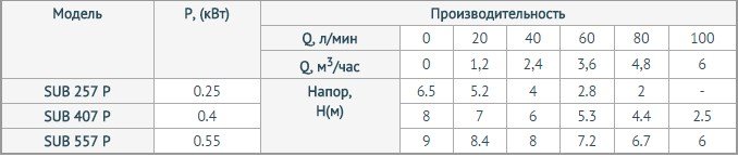 SUB-557 P - насосы серии SUB предназначены для отвода сточных дождевых вод и откачивания воды из колодцев и плавательных бассейнов (максимальный размер механических включений может достигать 5мм.) Глубина погружения в перекачиваемую жидкость до 8 метров.
