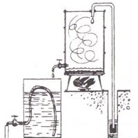 Образовавшийся пар начинает поступать в шланг, который опущен в источник воды и вытесняет из него воздух. После того, как мы «выключим» подогрев, воздух в бочке начинает остывать и создается зона разряжения в шланге и туда начнет под атмосферным давлением поступать вода из источника.