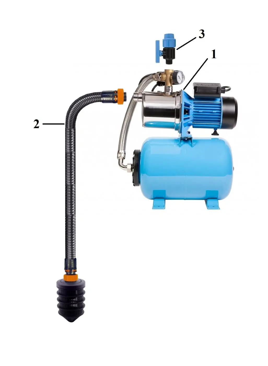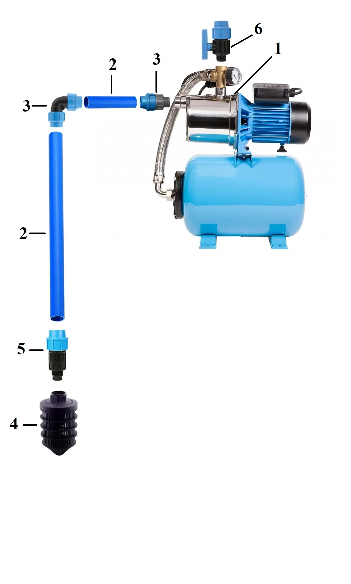 Источник воды: открытый водоём, скважина, колодец, резервуар. Самая распространенная схема установки насосной станции. Имеет водозаборный фильтр, обратный клапан и шаровый кран. Рекомендуемый диаметр полиэтиленовой трубы-32мм.
