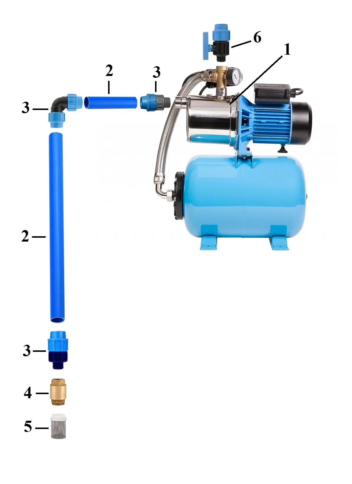 Самый простой способ установки насосной станции-использовать специализированный шланги-комплекты для всасывания, которые включают в себя все необходимые составляющие: фитинги для соединения, трубу, обратный клапан и водозаборный фильтр.